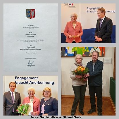 Anlässlich des Weltfrauentags hat Waltraud Giese am 8. März 2023 von Schleswig-Holsteins Ministerpräsidenten Daniel Günther die Ehrennadel des Landes verliehen bekommen. Diese Ehrennadel erhalten Menschen, die sich durch ihr besonderes Engagement im sozialen Bereich verdient gemacht haben.